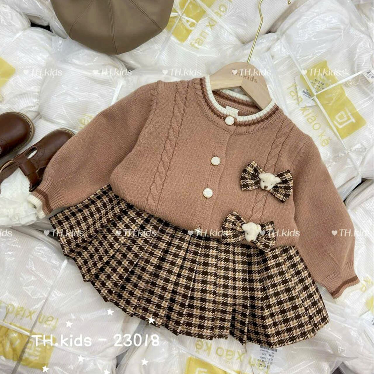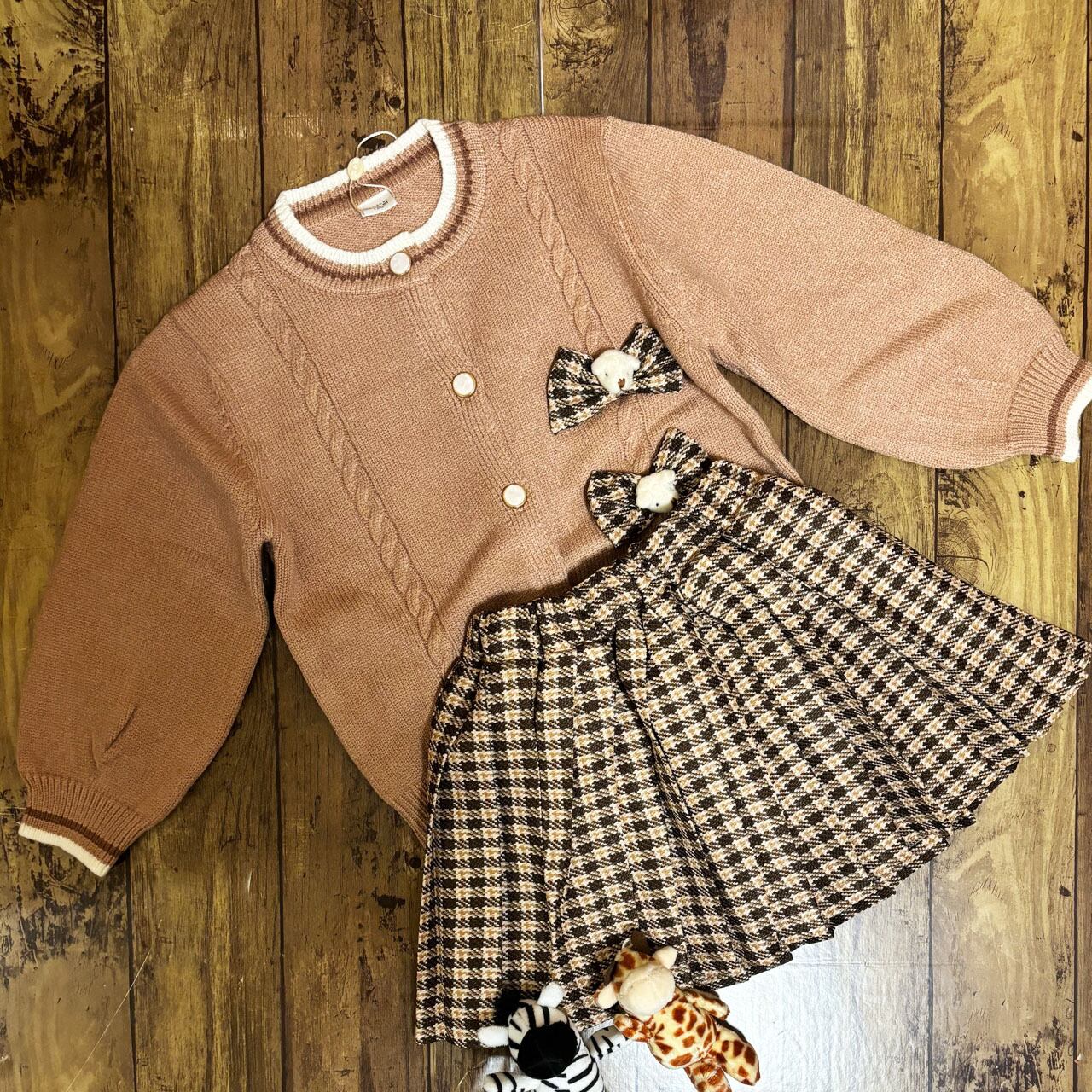 SOLD OUTトラディショナルなプレッピースタイルが可愛らしい、ガールズニットウェアセットです。ボタンフロントのニットウェアとプリーツスカートがセットになっています。