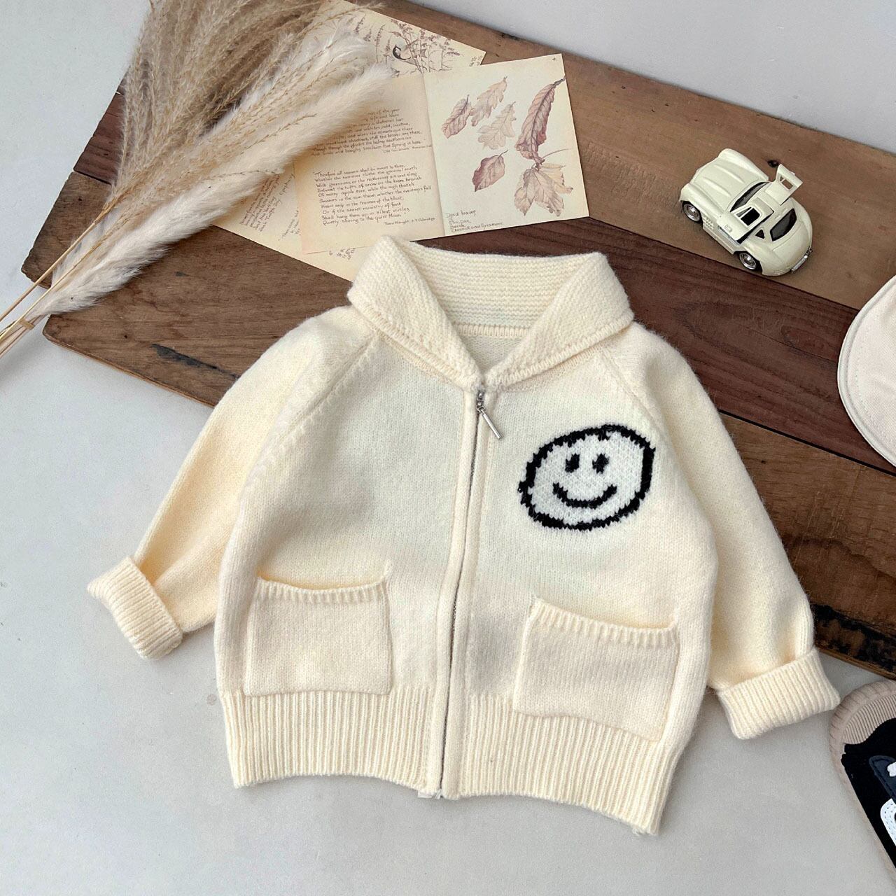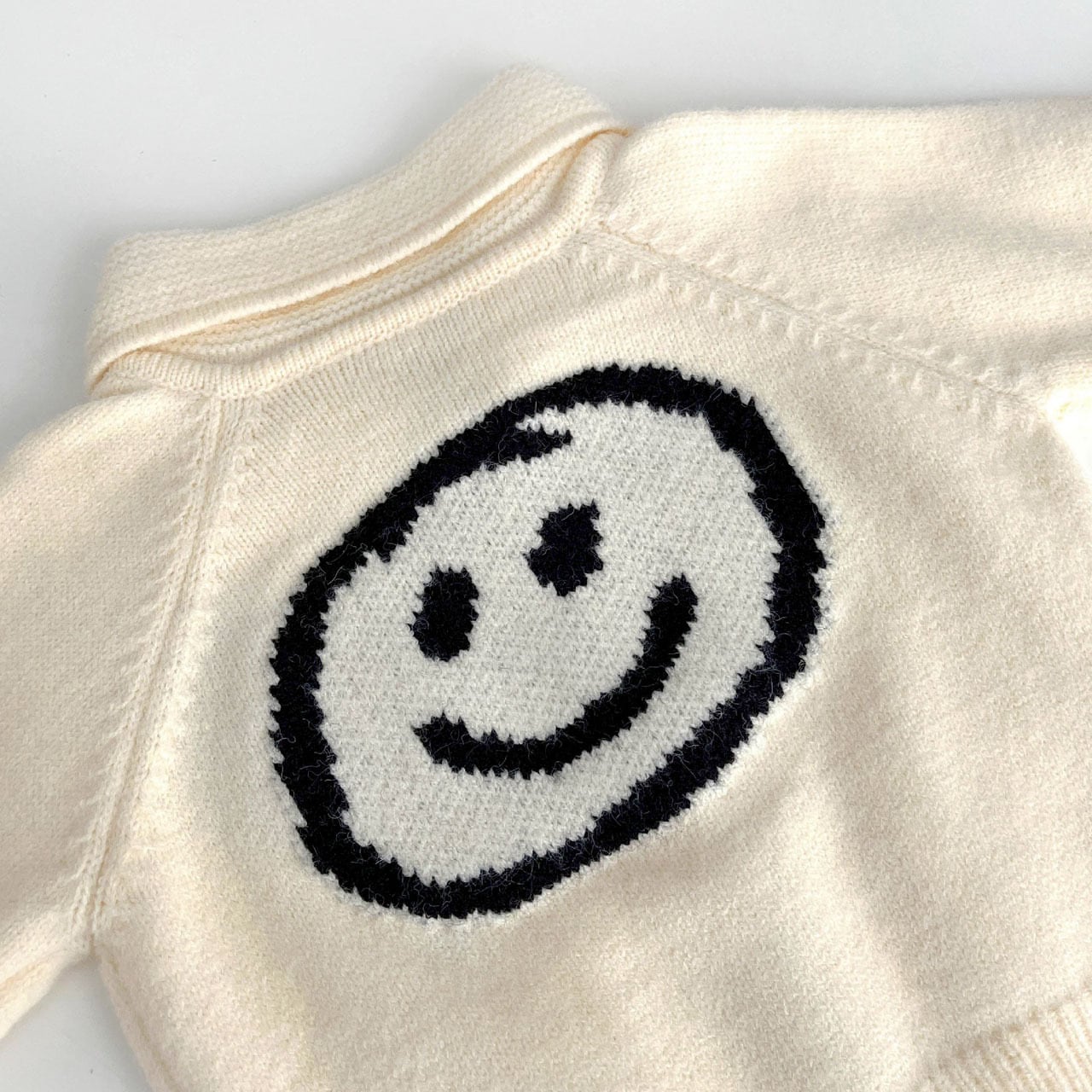 SOLD OUT暖かさとオシャレなニットアウターが登場。ワンポイントのスマイル刺繍がアクセントです。ジッパータイプなので着脱も簡単ですし、ジッパーを上まで上げれば、首元までしっかりと暖かく保てます。